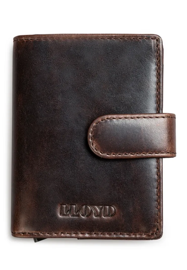 The LLOYD brand card holder made of smooth leather impresses with its compact and elegant design measuring 8 x 10.5 cm.nThere is a small coin compartment on the outside, which is securely closed with a zip. An open slip pocket offers space for notes, while a separate credit card compartment enables quick and easy handling. The integrated card protector is particularly practical, allowing cards to be slid out with a simple movement. The RFID protection also ensures that your cards are safe from unauthorised reading. This card holder combines stylish design with high functionality and security, ideal for the modern lifestyle.