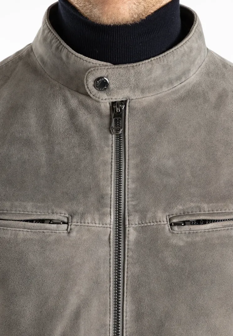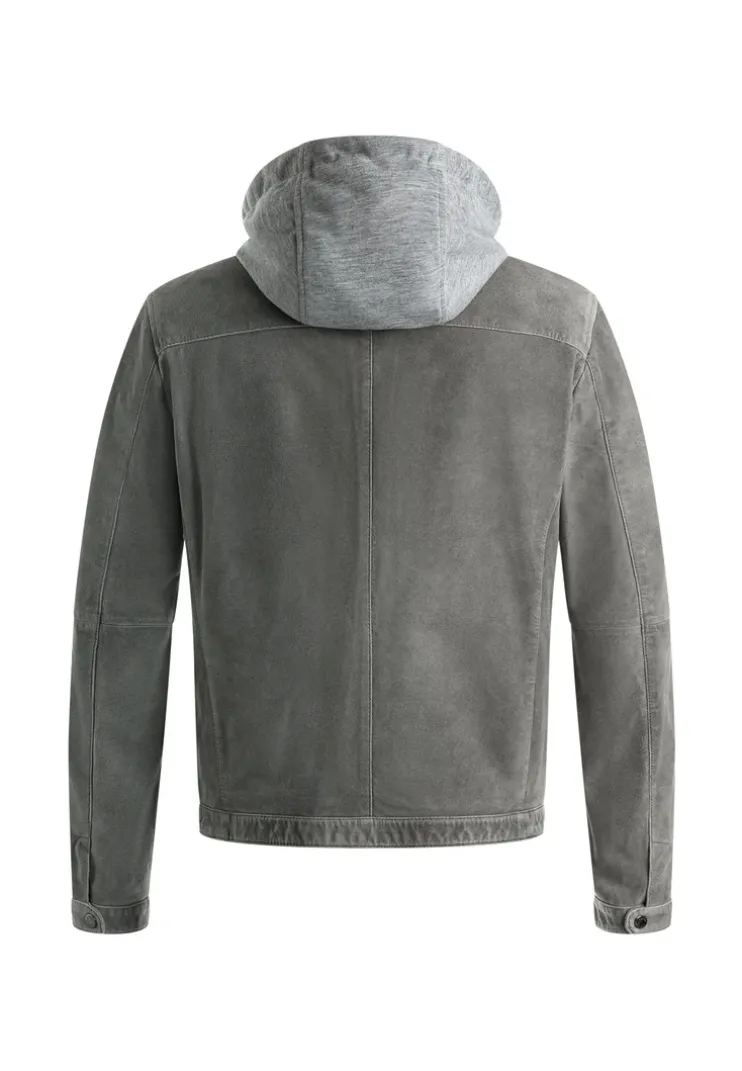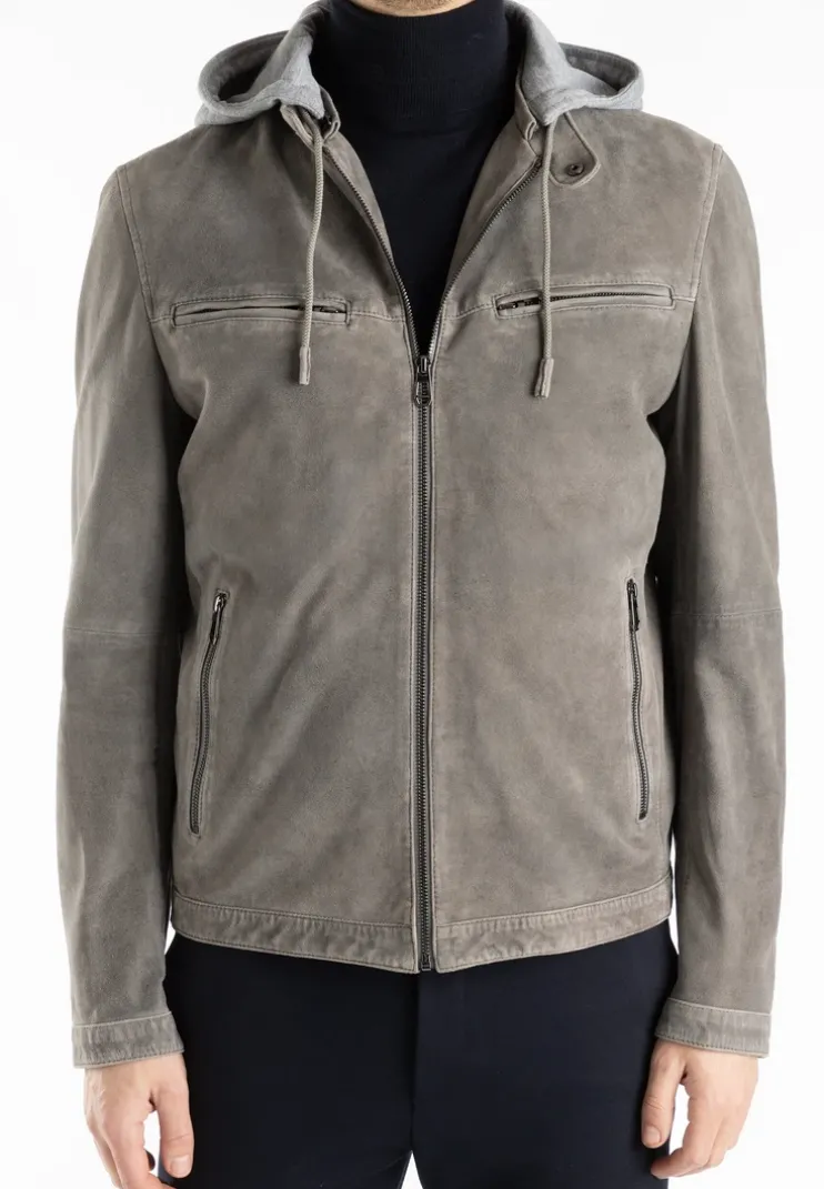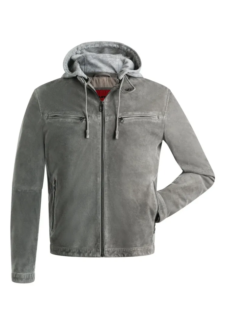The “HURLEY” jacket from LLOYD is a fitted suede jacket made from lambskin with a detachable hood made from a cotton blend that can be adjusted using a drawstring. It has a stand-up collar with press stud tabs, press stud cuffs and hem, horizontal breast pockets with zips and slanted front zip pockets. There is a zip pocket and a slit pocket on the inside.