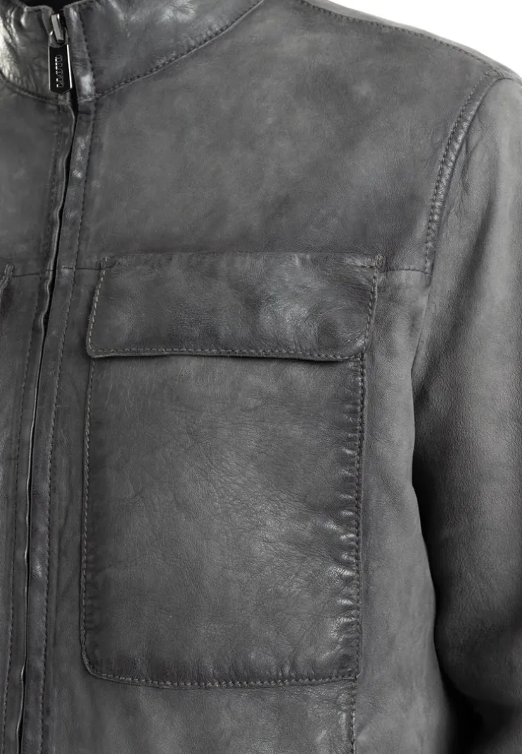 The LLOYD biker jacket with a stand-up collar, crafted from textured leather, features a slimmer fit and robust metal zippers. Two hand pockets and two chest pockets with snap closures provide practical storage. It includes an inner zip pocket, two open inner pockets, and a lining made from recycled Italian wool, combining sustainability with functionality. The model is 1.87 m tall and wears a size 50.n