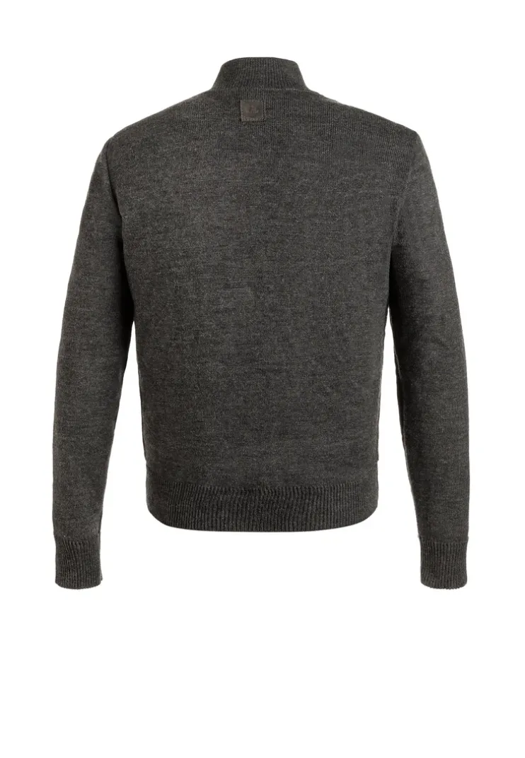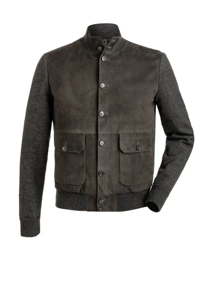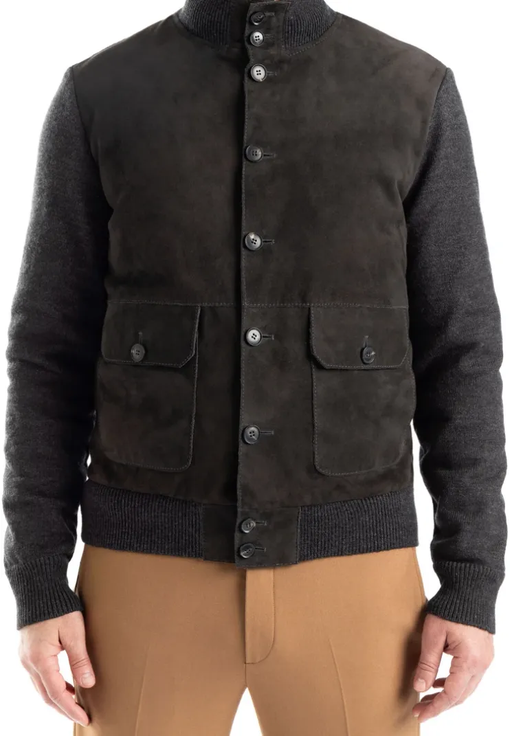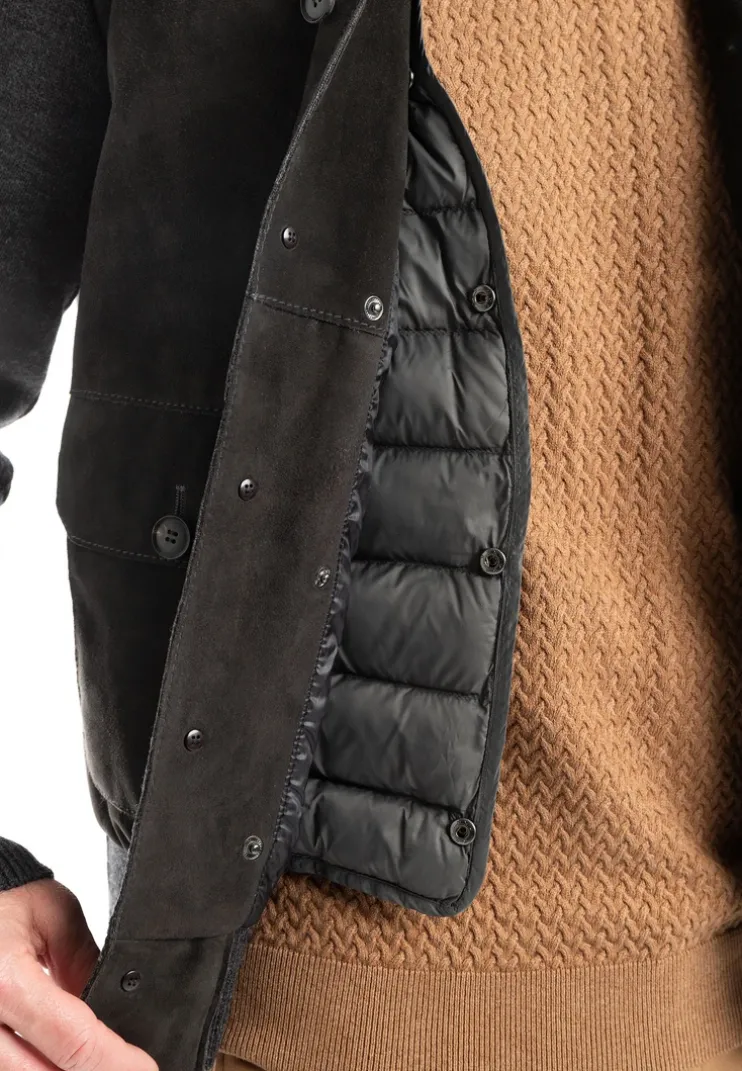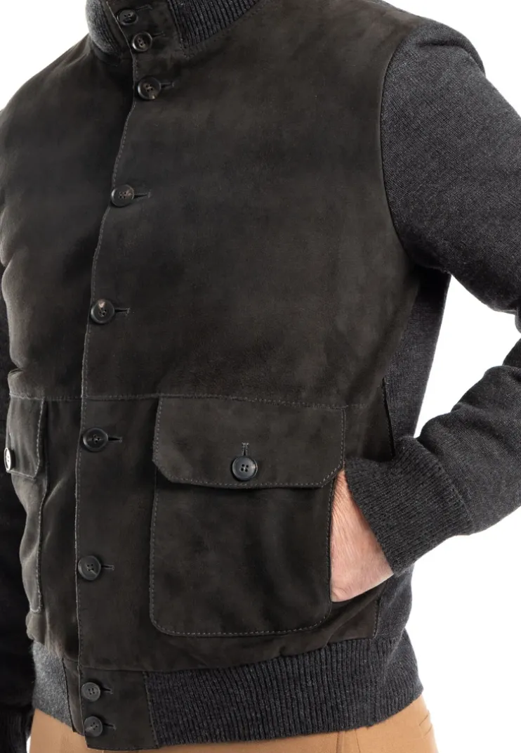 The LLOYD hybrid jacket combines wool knit with a front panel made from soft goat suede. The button placket features high-quality buttons with a genuine horn appearance. A removable nylon quilted vest adds versatility. It includes a stand-up collar and hem finish in elastic rib knit. Button-closure flap pockets and additional side-entry pockets offer practical storage. An inner zip pocket and two open inner pockets complete the thoughtful design. The model is 1.87 meters tall and wears a size 50.n