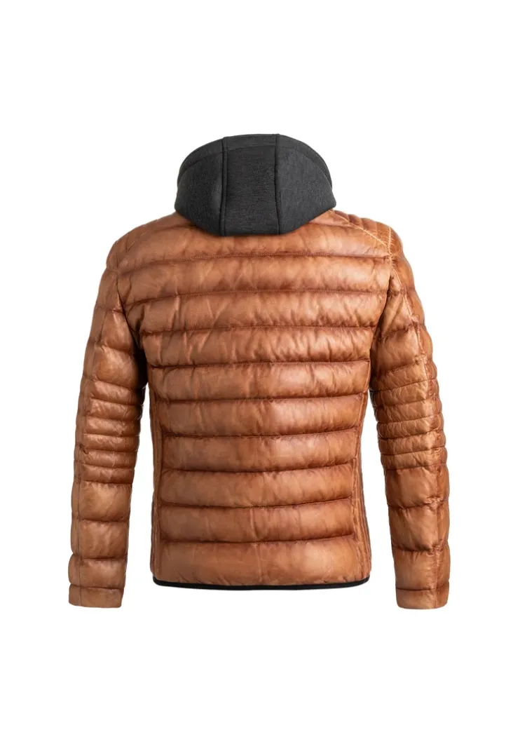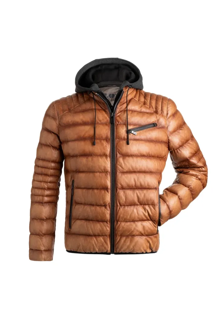 Discover the LLOYD quilted jacket made from sheep leather with a detachable inner panel and hood in jersey melange. This jacket features a high collar and robust zippers. Practical elements include side zippered front pockets and a chest pocket with a zipper. Inside, it offers two zippered pockets and an open pocket. The sustainable Dupont Sorona Aura insulation provides warmth and comfort during colder seasons. The model is 1.87 metres tall and wears a size 50.n