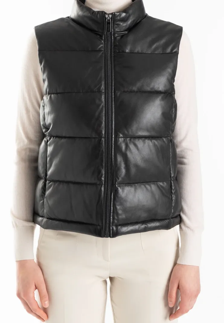 The padded lambskin quilted waistcoat from LLOYD is a stylish and versatile garment for every season.nThe stand-up collar and zip fastening give the waistcoat a modern look and make it easy to put on and take off. Pockets with seam zips provide practical storage space for small items, while a slip pocket with Velcro fastening on the inside offers additional storage options. The hem is equipped with an adjustable drawstring that allows you to customise the fit. This padded quilted waistcoat from LLOYD combines high-quality lambskin leather with well thought-out details and is a must-have for any well-equipped wardrobe. The model is 1.78 m tall and wears a size 38.