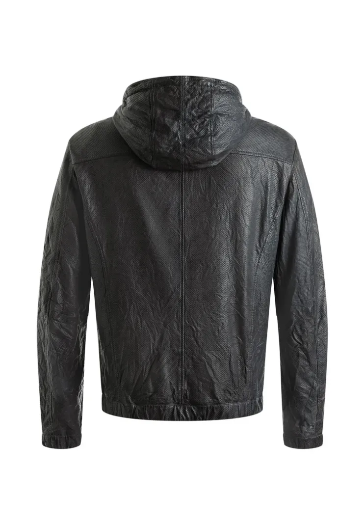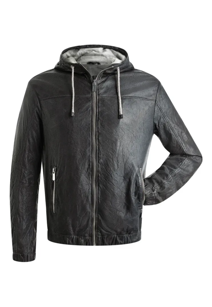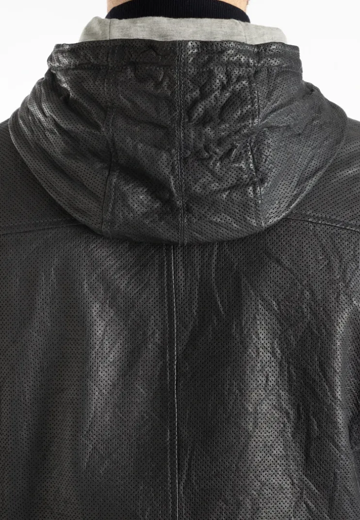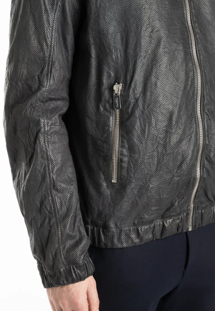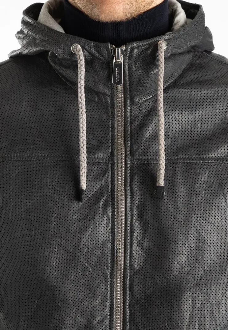 The “BERO” jacket by LLOYD is a fitted, perforated leather jacket made from lamb leather. It has a stand-up collar with a hood and a drawstring to adjust the width. It also has two side zip pockets and a zip pocket and two slit pockets on the inside. The jacket is lightly lined with a cotton blend.