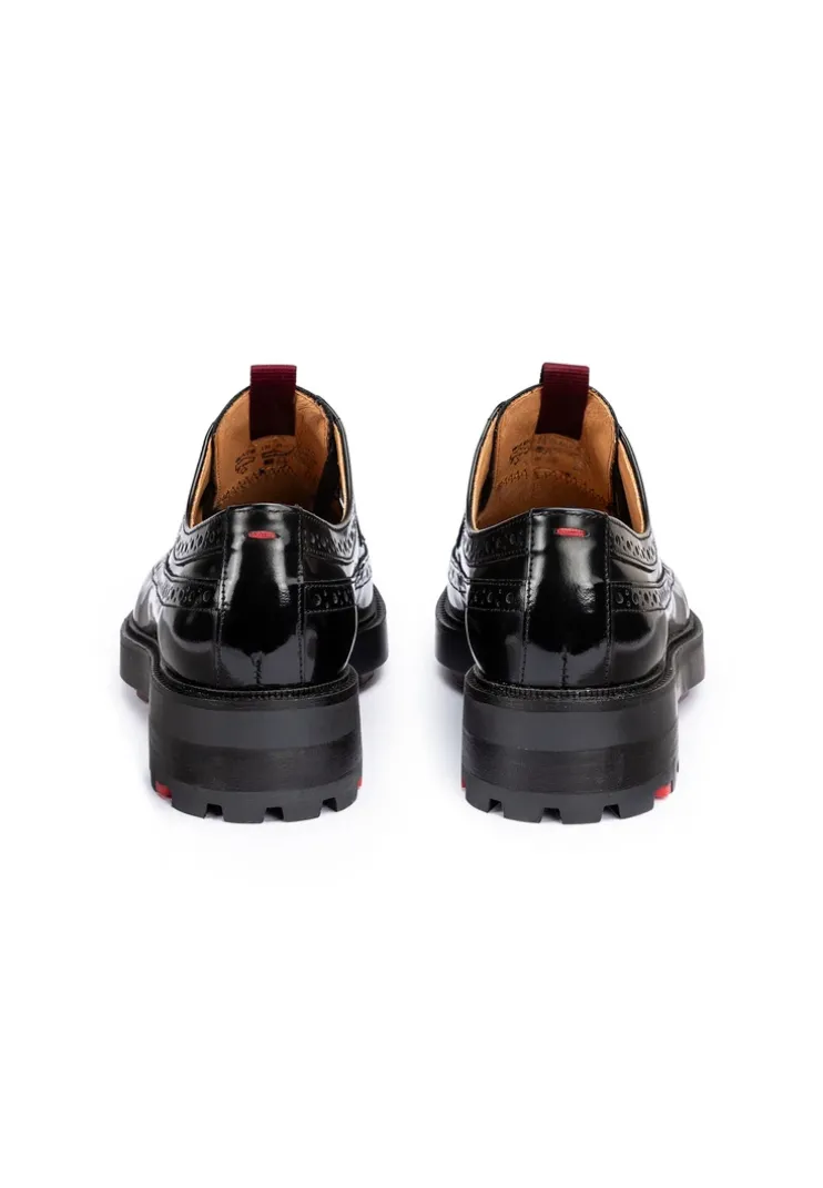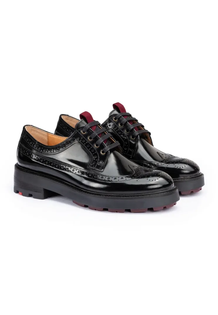 LLOYD offers lace-up shoes made from shiny black leather that impress with their elegant look. The lace-up shoes provide a secure fit thanks to the lacing. The elastic rubber sole provides ideal cushioning when walking. The leather insole on the inside ensures good heat regulation. Thanks to the flat block heel, the lace-up shoes offer a secure stance and are particularly suitable for everyday wear. The shoe creates an elegant look with its elegant, shiny leather and, in combination with the fastening, ensures a firm, secure hold. The leather and textile lining makes the lace-up shoes comfortable and breathable.n