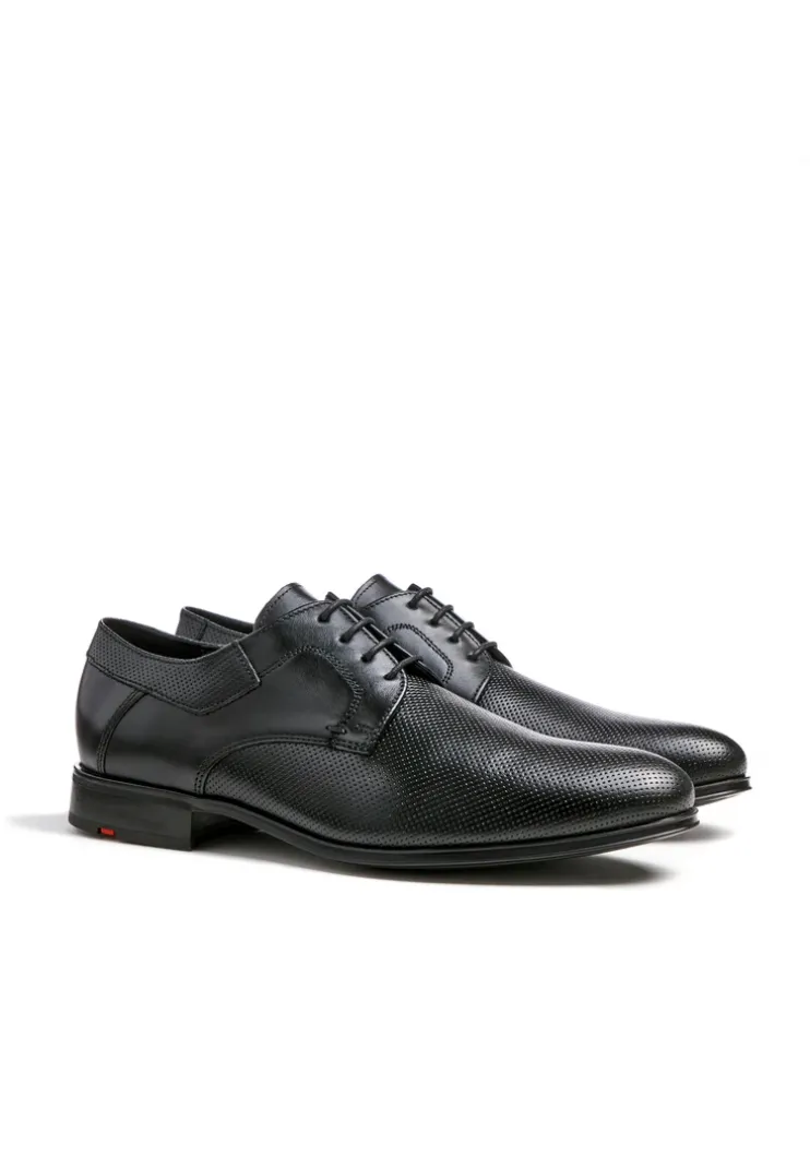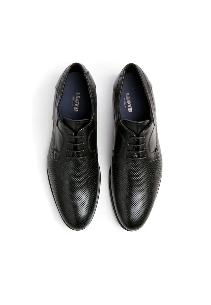 The LLOYD “LEVIN” Derby shoes made of black leather impress with a fashionable style. A classic and elegant appearance is achieved with this lace-up shoe. The abrasion-resistant rubber sole provides ideal cushioning when walking. The leather insole ensures good heat regulation. The lacing and the fashionably embossed leather ensure an original look and the perfect fit. The leather and textile lining makes these lace-up shoes easy to wear and breathable.