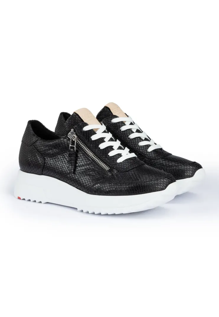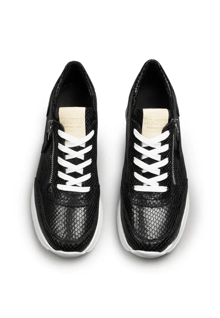 The LLOYD trainers made with black leather feature a strong and shock-absorbent sole. A casual look is guaranteed in these shoes. A non-slip rubber sole cushions the impact when walking and the leather of the inner sole offers good heat regulation. Easy fastening and an original look are guaranteed with the stylish embossed leather upper, the zip fastening. These leather and textile lined shoes are comfortable and breathable. The model features an Extralight® sole which is particularly lightweight and flexible as well as non-slip and shock-absorbent.