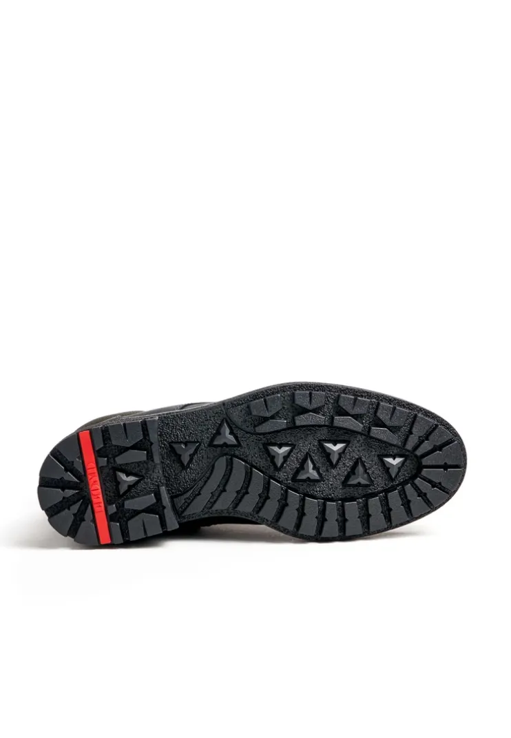 The LLOYD »VARNDELL« lace-up ankle boots designed with black smooth leather feature an all over waterproof and extremely breathable GORE-TEX membrane suited for any weather. In these lace-up shoes, a biker chic look is a given. Their wear-resistant rubber sole cushions the impact when walking perfectly.. The zip fastening as well as the soft smooth leather upper guarantee a classic, elegant appearance and quick fastening. Even when it’s cold these shoes are warm, regulate the temperature as well as snug by use of the lambskin fur lining.